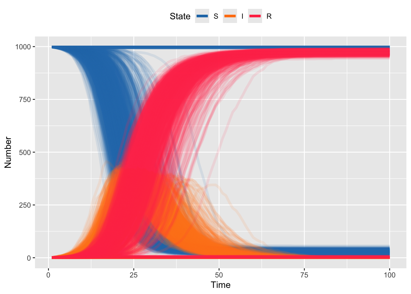 }Note in the code above that we’re taking Poisson random draws, but there is some code commented out that uses binomial draws. The former is exact for the theory, but it can give rise to settings where the transitions “get ahead of themselves” and you have more recoveries than infecteds, or more infections than susceptibles, which drives the states negative. We can fix this by checking if the states go negative and disallowing this … which is inelegant. We can also fix this by using binomial draws, which are naturally constrained not to go negative. The reason we don’t automatically start with binomial draws is that they are computationally slower than Poisson draws (this occurs because the binomial distribution includes some combinatorial terms that are slow to compute). As computers have gotten faster, this is less of an issue.